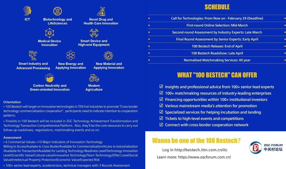 As one of the hallmark events of the International Technology Trade Fair at ZGC Forum, the “100 Best Innovative Technologies for International Cooperation” (100 Bestech) has been organised thrice since 2020. A jury of more than 100 industry-leading experts participate in the review of technologies to select the top 10 leading projects in target sectors and the 100 most promising innovations at the international level for publishing them at the ZGC Forum.