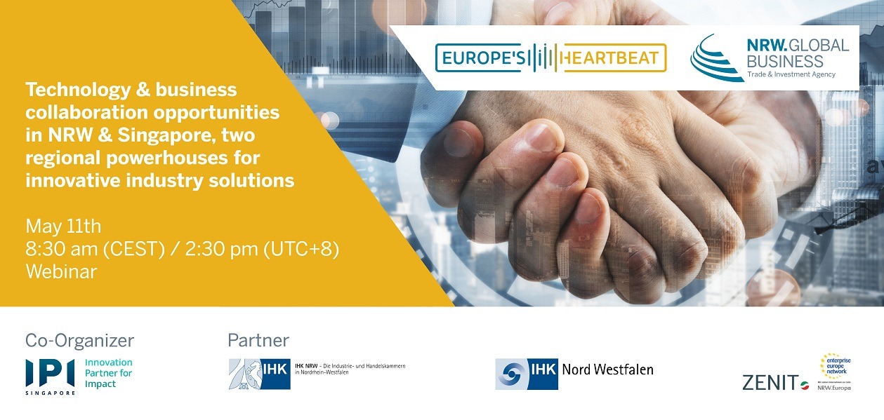 The webinar on Technology and Business Collaboration Opportunities in NRW and Singapore will introduce the future of smart industry solutions in both regions to local companies with smart manufacturing solutions and start-ups that are exploring new technology and business opportunities in North Rhine-Westphalia (NRW) and Singapore. Held on 11 May 2022, from 2.30 pm to 4.30 pm (GMT +8), it is jointly organised by IPI Singapore and NRW.Global Business as well as ZENIT and the Enterprise Europe Network.