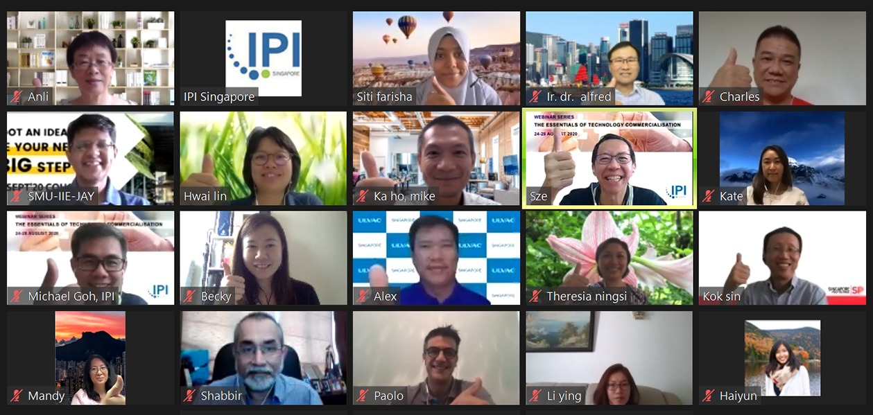 Held from 24 to 28 August 2020, the first Essentials of Technology Commercialisation webinar series by IPI brought together a group of enthusiastic learners from institutes of higher learning, tech transfer offices and industry players from Singapore, Hong Kong and Indonesia for a week of online learning. Participants learnt the basics of assessing commercial potential of new technologies, and the strategies and tools for technology marketing, valuation and licensing from trainers – IPI's Head of Intermediary Dr Sze Tiam Lin and Deputy Head of Intermediary Michael Goh.