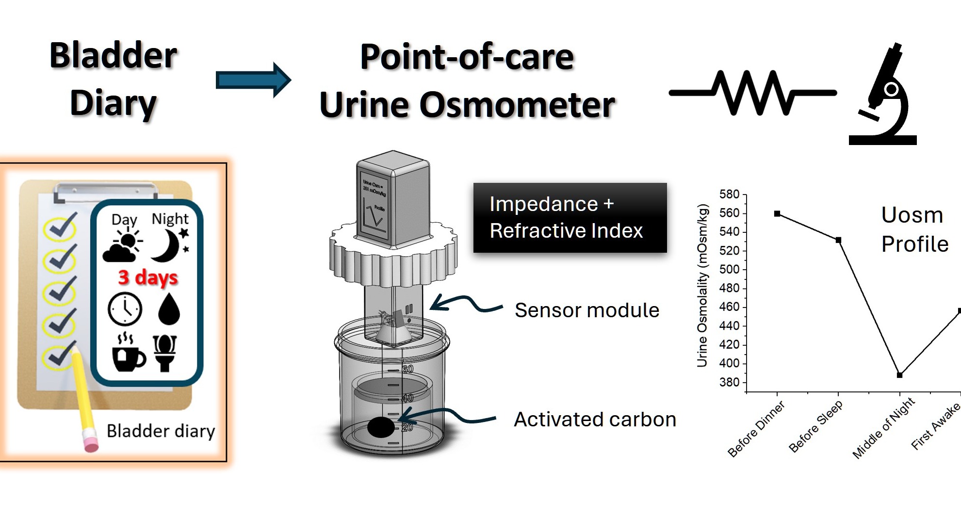 This technology has developed a point-of-care urine osmometer for the monitoring and profiling of day- and night-time variation in urine osmolality, providing clinicians with valuable insights to facilitate more accurate, objective diagnosis and personalized treatment plans for nocturia. This device is portable and attached with a readout sensor, designed to be user friendly.