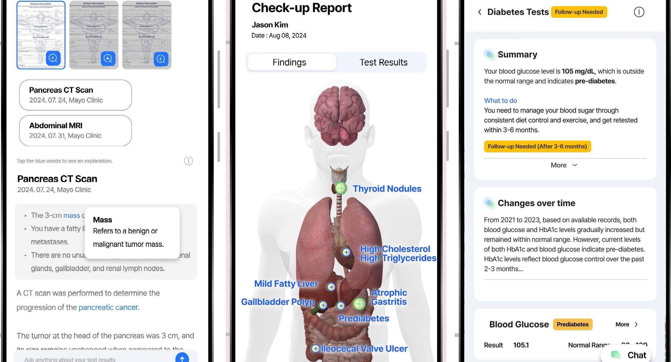 The technology bridges the gap between complex medical terminology and patient comprehension, significantly reducing the time required to interpret and understand medical information. With over 600,000 patient-uploaded medical documents and 120,000 registered patients (70%+ cancer patients) and caregivers, the platform has demonstrated substantial market adoption. This solution provides comprehensive end-to-end healthcare support, seamlessly connecting the entire patient journey from screening to follow-up care through integrated data synchronization and HIPAA-compliant infrastructure.