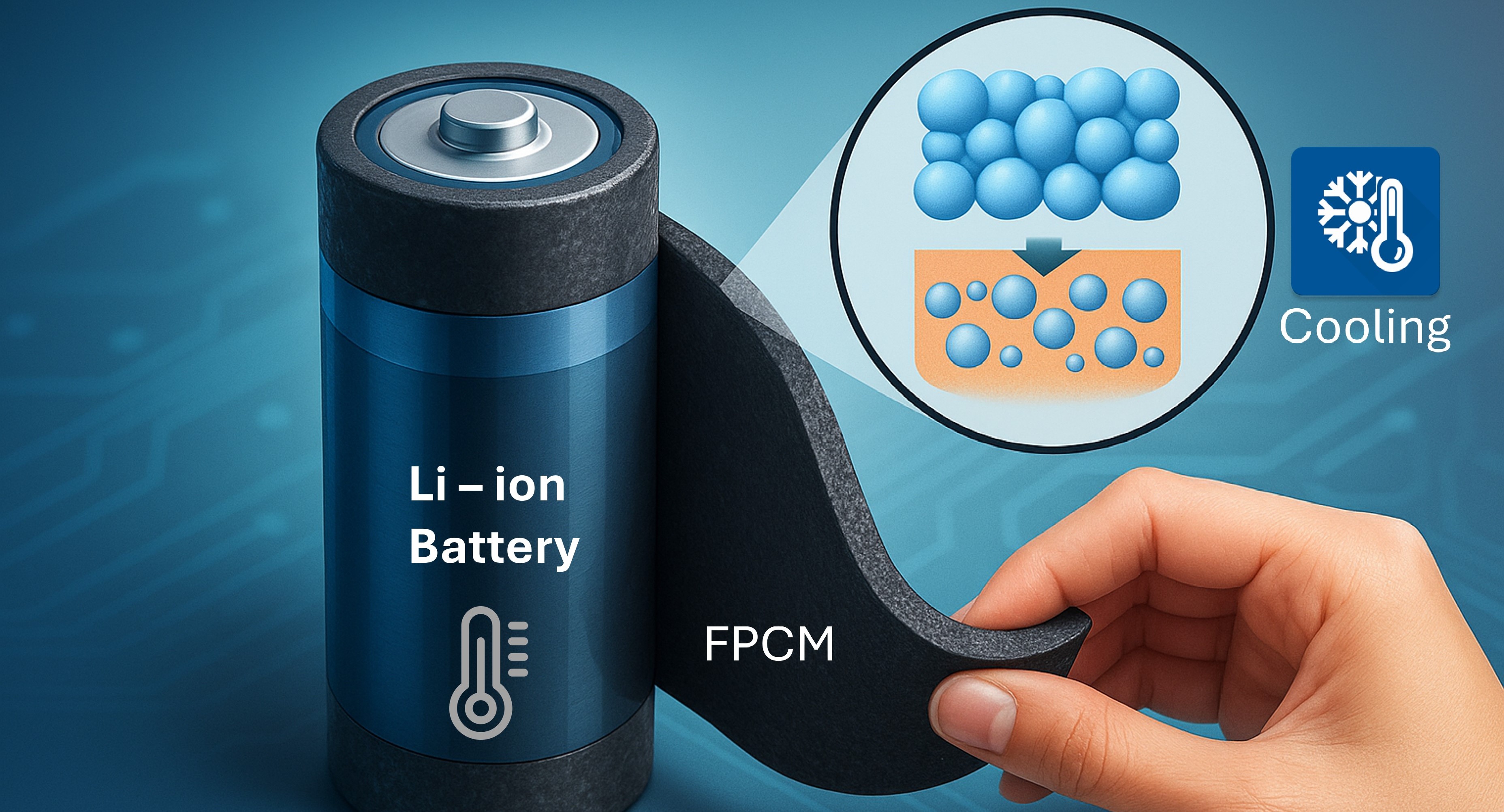 This process enables improved dispersion, strong interfacial compatibility, and structural integrity while significantly reducing energy consumption during fabrication. The optimized FPCMs demonstrate enhanced thermal conductivity (up to 1.38 W/m·K), robust flexibility under mechanical deformation and excellent phase change stability. Thermal performance tests on lithium-ion batteries under various charge–discharge conditions showed up to 17 °C reductions in peak battery temperature and improved capacity retention at high C-rates. It proved the FPCM’s reliability, scalability, and energy efficiency for advanced BTMS applications, particularly in environments demanding mechanical adaptability and high safety standards.