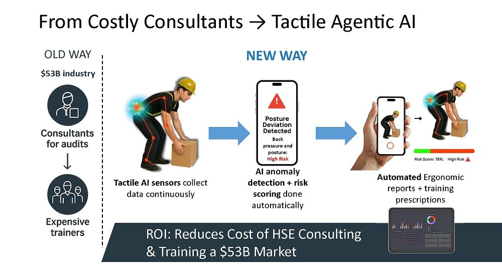Unlike vision-based monitoring systems that rely on cameras and clear line-of-sight, this tactile AI technology is fully wearable and suitable for any work environment. By capturing biomechanical data directly from body pressure, it enables real-time and proactive injury prevention rather than merely detecting issues after they occur. Its predictive tactile analytics allow the system to anticipate risky movements, while its scalable AI foundation continually improves by learning from an expanding database of tactile data points. The technology is highly adaptable across industries—from logistics and healthcare to sports—and is built with a privacy-first design that avoids the use of any video or image data.