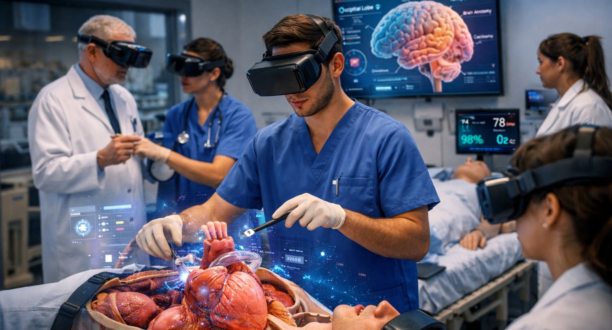 Healthcare education globally faces a compounding crisis: growing demand for trained professionals, limited clinical placement capacity, inconsistent assessment standards, and patient safety risks during early-stage practice. Studies indicate that approximately 90% of clinical mistakes occur within a practitioner’s first 30 cases. This technology is an integrated Extended Reality (XR) simulation ecosystem delivered through lightweight, wireless head-mounted display devices. Wearing these headsets, learners are visually and spatially immersed in computer-generated three-dimensional clinical environments—hospital wards, emergency rooms, paediatric units, outpatient clinics—that respond to their gaze, movement, and hand gestures in real-time. Within these environments, learners interact with artificial intelligence-driven virtual patients that converse naturally, exhibit realistic body language, and present evolving physiological conditions based on the learner’s clinical decisions. Handheld controllers and haptic devices provide tactile feedback, enabling learners to physically practise procedures such as chest compressions and pulse detection with sensory realism.